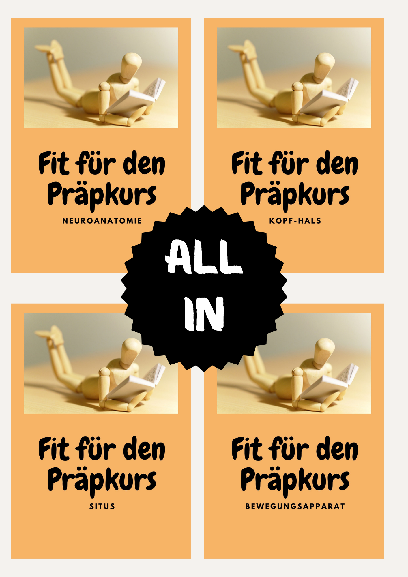 Hier erhältst Du das Gesamtpaket Fit für den Präpkurs mit allen Modulen: Bewegungsapparat, Situs, Kopf-Hals und Neuroanatomie.